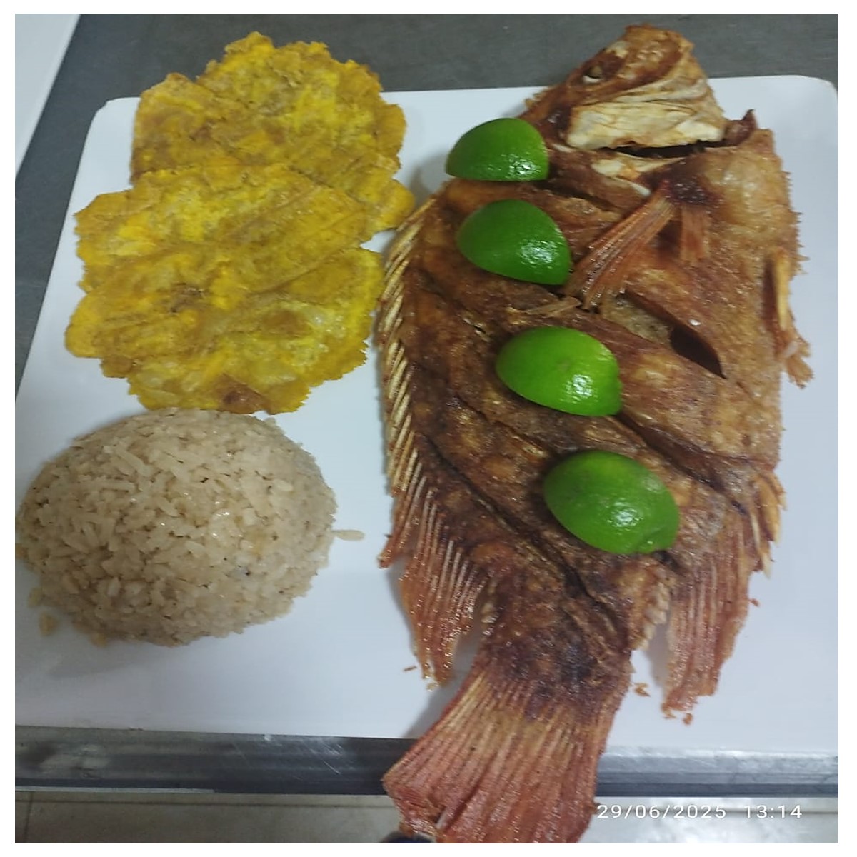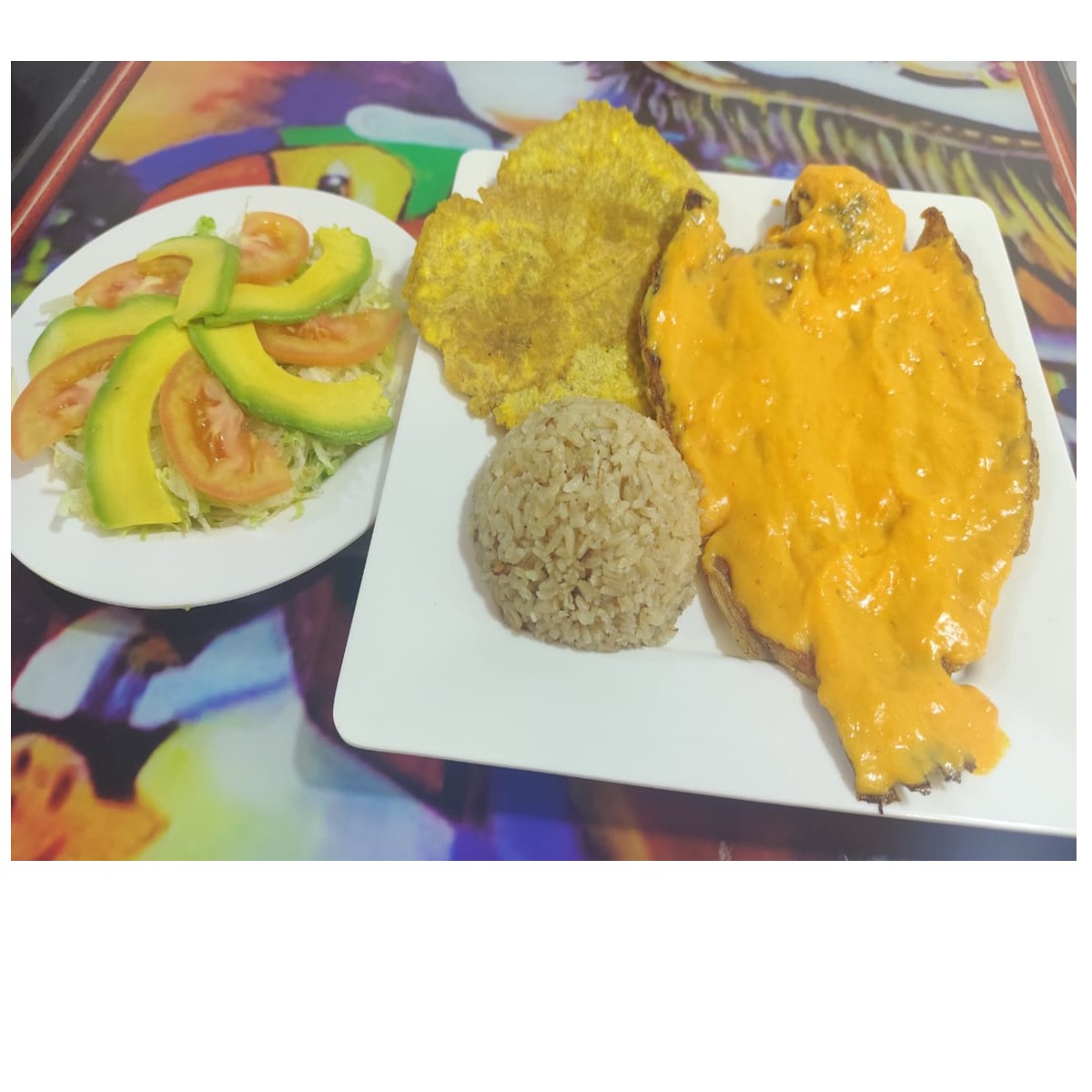 Pescados frescos con preparación tradicional de la costa. Acompañado con arroz con coco, ensalada, papa a la francesa o patacón.